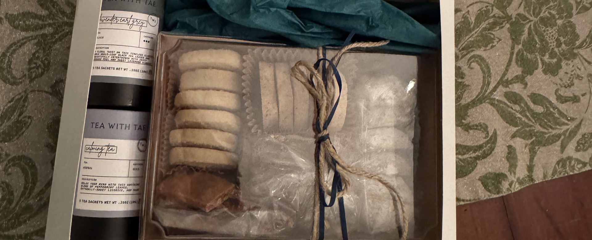 Each month we create sweet boxes of carefully curated cookies. The box contains four types of cookies, 3-6 of each, some kind of special sweet treat or candy, and your choice of a sample of local tea or coffee, all wrapped up and boxed for freshness. Each box has a message about the month or the cookies, including the ingredients for each cookie. Finally, the box is sealed with our signature teal green ribbon for a lovely touch.